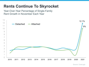 While it’s true home prices and mortgage rates are rising, so are monthly rents. As a prospective buyer, rising rates and prices shouldn’t be enough to keep you on the sideline, though. As the chart above shows, rents are skyrocketing. The big difference is, when you rent, that rising cost benefits your landlord’s investment strategy, but it doesn’t deliver any sort of return for you.