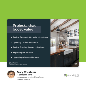 Undertaking small projects around the house can be a strategic move to boost resale value while enhancing your lifestyle at the same time! Simple upgrades like replacing outdated fixtures, applying a fresh coat of paint, or adding energy-efficient appliances not only modernize the home but also make daily living more comfortable and enjoyable. Not sure what projects to invest in? Give me a call.