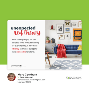 The color red, long celebrated in fashion for adding vibrancy to neutral outfits, is now making waves in home staging. While traditional home staging leans heavily on neutral tones to appeal to a wide audience, incorporating subtle red accents can create visual impact, making it more memorable for potential buyers. Questions about staging your home for sale? Send me a message – I’m here to help.