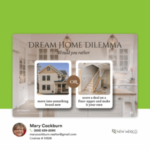 New or needs a little love – what’s your dream home style?  Some buyers love the sparkle of brand new, while others see protentional in a fixer-upper.  No matter your preference, I’ll help you weigh the pros and cons so you can make the best move for your lifestyle and budget.  Ready to start the search?  Let’s connect and create a plan!