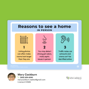 Seeing a home in person offers numerous benefits that virtual tours or photos can’t fully replicate. For example, seeing the property’s size, layout and overall condition, helps you assess whether it meets your needs and preferences. If you’re ready to stary looking at homes, whether virtually or in person, contact me and let’s get started.