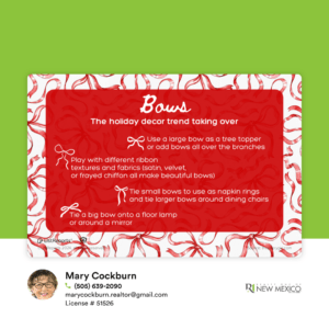 Looking to wrap your home in holiday cheer? Bows are the versatile décor trend of the season! From topping your tree to dressing up your dining room chairs, they’re the perfect way to add festive flair with minimal effort. Pro tip: mix textures and fabrics for designer touch. Are you ready to deck the halls in new space next year? Let’s find your dream home – send me a message today!